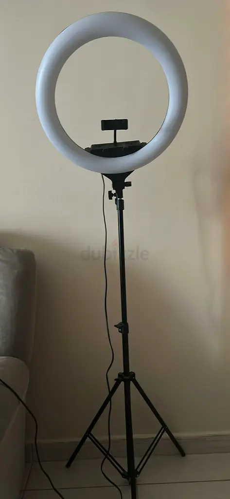 I'm selling my ring light with adjustable tripod and phone holder. I bought it about 1–6 months ago and used it only once. It's in excellent condition and works perfectly — adjustable brightness and color temperature, sturdy tripod that extends to standing height, and a phone mount that fits most smartphones. No warranty. Comes with the USB power cable shown. Specifications: