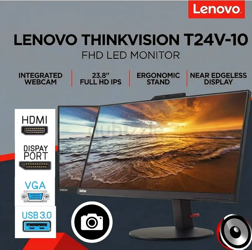 Lenovo THINK VISION T24V-10 24” BORDERLESS IPS FHD Monitor-BUILT IN SPEAKER-CAMERA-HDMI-DP PORT-VGA