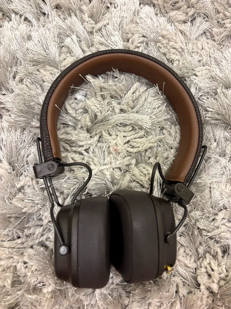 سماعات الرأس هذه هي Marshall Major IV باللون البني. توفر أكثر من 80 ساعة من وقت التشغيل اللاسلكي بشحنة واحدة. يمكن شحنها لاسلكيًا أو باستخدام كابل الشحن USB-C المرفق. تتميز بصوت Marshall المميز مع جهير قوي وثلاثي لامع. تصميم قابل للطي لسهولة الحمل والتخزين. تتضمن مقبس 3.5 ملم لمشاركة الموسيقى مع صديق. These headphones are Marshall Major IV in brown.