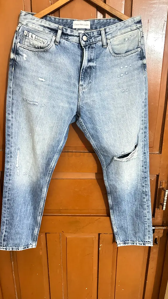 I’m selling a pair of light blue distressed Calvin Klein men’s jeans, size M. I bought them recently and they’ve only been worn once. They have intentional distressing with small abrasions and a larger ripped area on one knee, consistent with the style. Color is a faded light blue, regular fit through the legs with a standard rise. Condition is excellent apart from the designed distressed details. No stains, smells, or structural damage to seams or zipper.