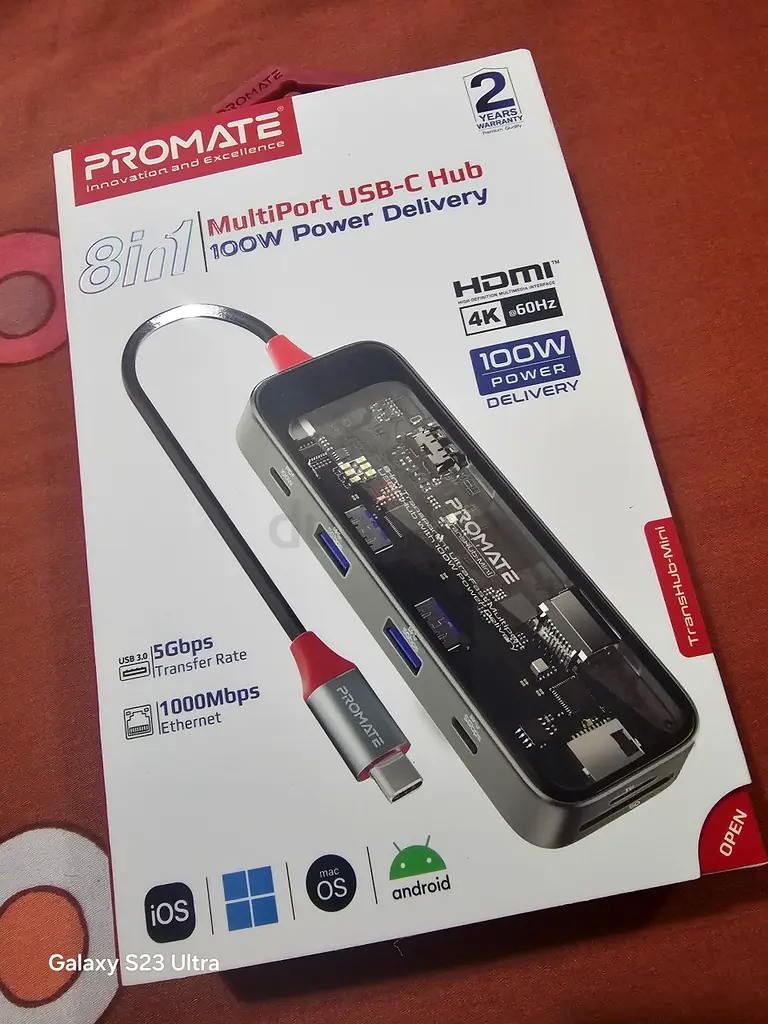 I’m selling a brand new Promate 8-in-1 USB-C Hub, still sealed in the original box. I never opened or used it. It supports 100W Power Delivery for charging, HDMI output, multiple USB-A ports, Ethernet (100Mbps), SD/TF card reader, and a USB-C pass-through. Compatible with Windows, macOS, iOS, and Android devices that support USB-C. No warranty applies and it’s in flawless condition as shown.