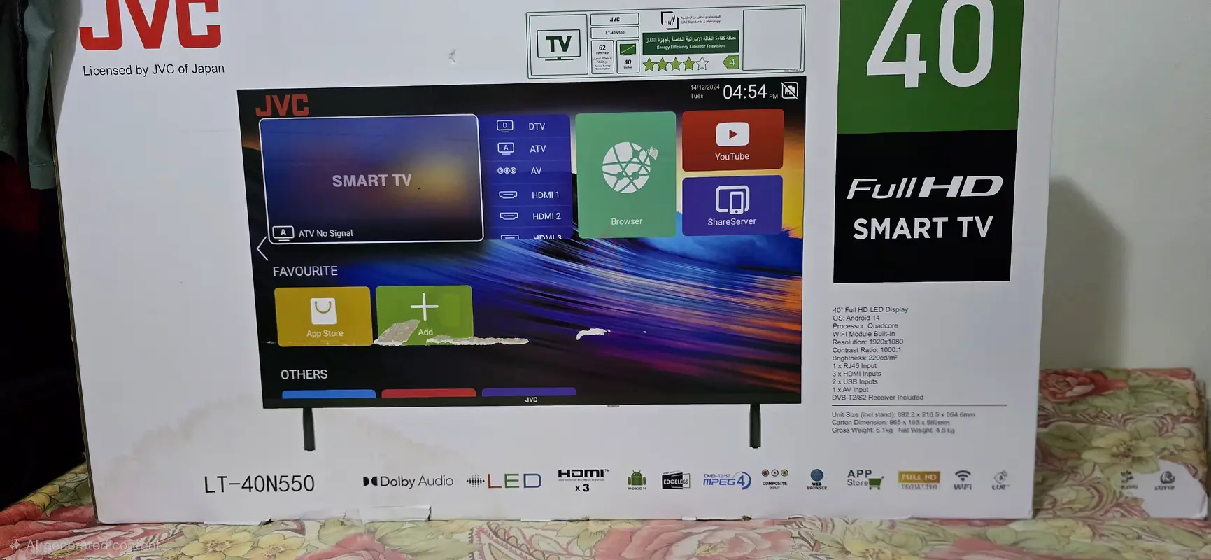 I'm selling my brand new JVC 40" Full HD Smart TV, which has never been used. It's in flawless condition and offers an HD-720p resolution, providing great picture quality. The table mount makes it easy to set up in any room. Since it's a JVC, you can trust its reliability and performance. This TV does not come with a warranty.