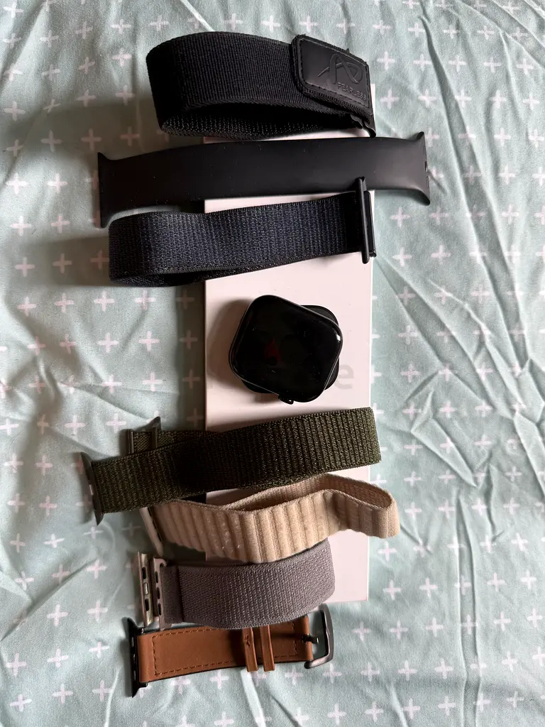 I'm selling my Apple Watch Series 10, 46mm, which comes with multiple bands. The watch is in flawless condition and has never been used. It features a sleek black dial and includes a variety of silicone bands in black along with others for versatility. The materials used are premium steel and durable rubber, making it both stylish and functional.