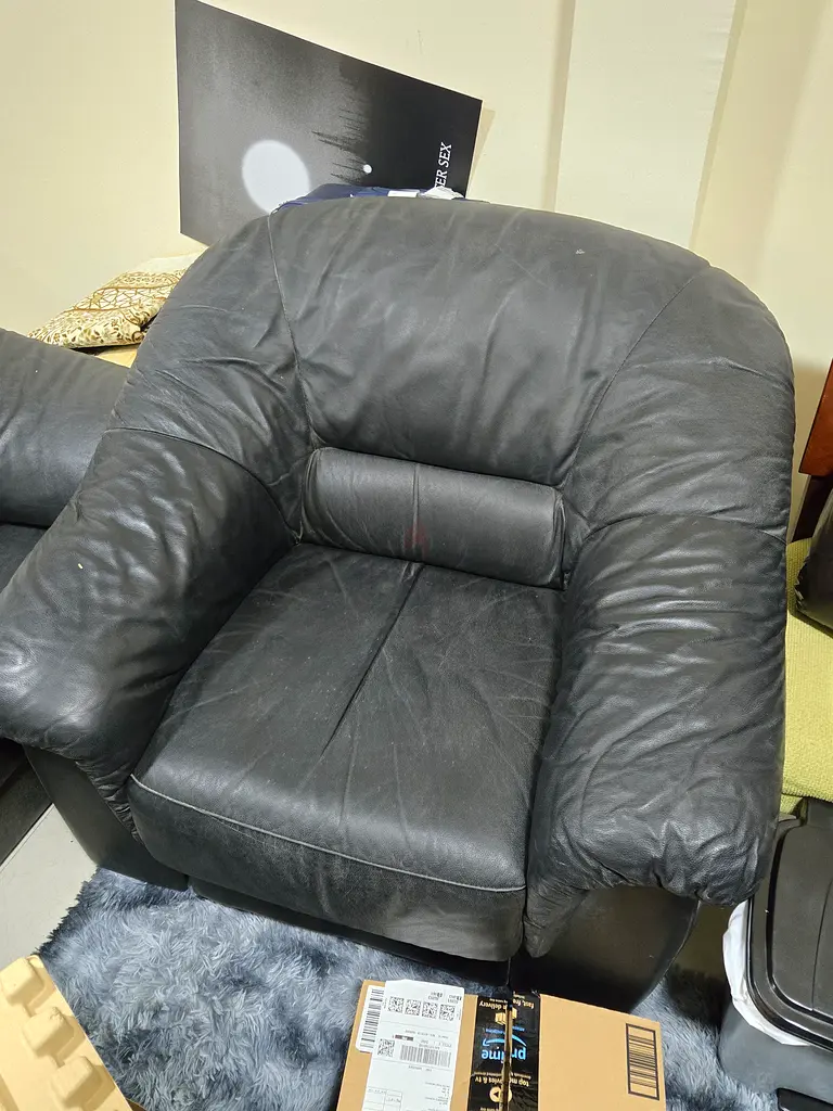 I'm selling a couple of black leather sofas that are perfect for any living space. They've been gently used over the past few years and show some signs of wear, but they still provide great comfort and style. The standard shape and casual design make them easy to fit into any room. Whether you're looking to create a cozy reading nook or need extra seating for guests, these sofas are a practical choice with decent durability.