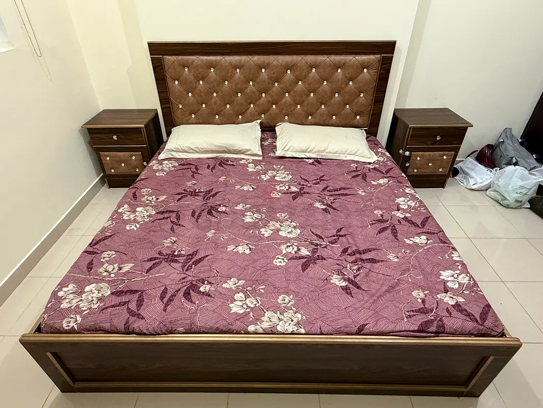 I'm selling a queen-size wooden bed frame with two matching bedside tables. The bed set is bought about 3 years ago and it's been in normal use since then. The frame is brown with a padded, tufted headboard that has decorative buttons. The wood finish is intact and there are no major scratches or damage. Both bedside tables match the bed and each has two drawers with working handles.