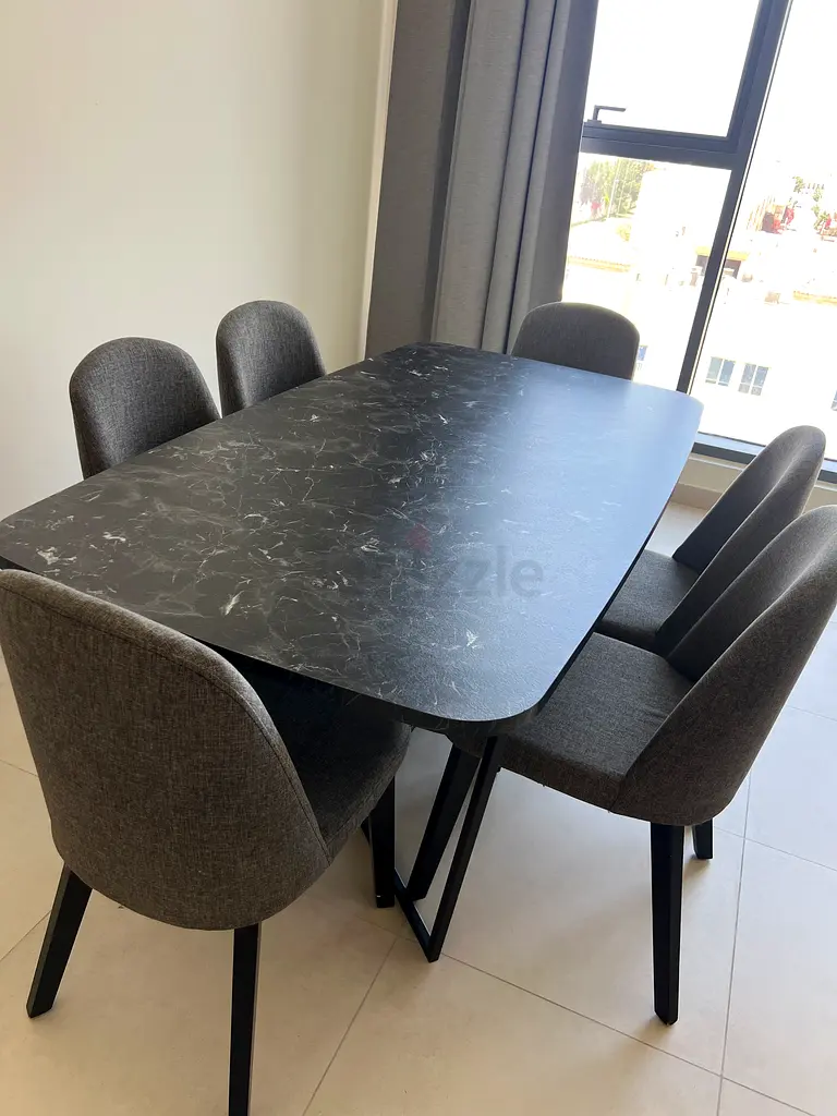 I’m selling a modern dining set I bought from Home Centre about 1–2 years ago. It includes a rectangular table with a black marble-look top and four grey upholstered chairs. The set has been lightly used and is in excellent condition — no stains, tears, or structural issues. The chairs are comfortable with padded seats and backrests, and the table has sturdy black metal legs. Ideal for a compact dining area or open-plan living space.