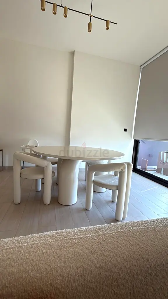 I'm selling a modern sculptural dining table set in a neutral beige tone — table plus 4 matching chairs. I bought this about 1–6 months ago and it's in excellent, unused condition. The set features a round tabletop with a unique arch-style sculptural base and clean, minimal chairs that seat up to 6 when paired with additional seating. Color is beige and the brand is unbranded/others. Perfect for a contemporary dining area or show apartment. Available for pickup; price as listed.
