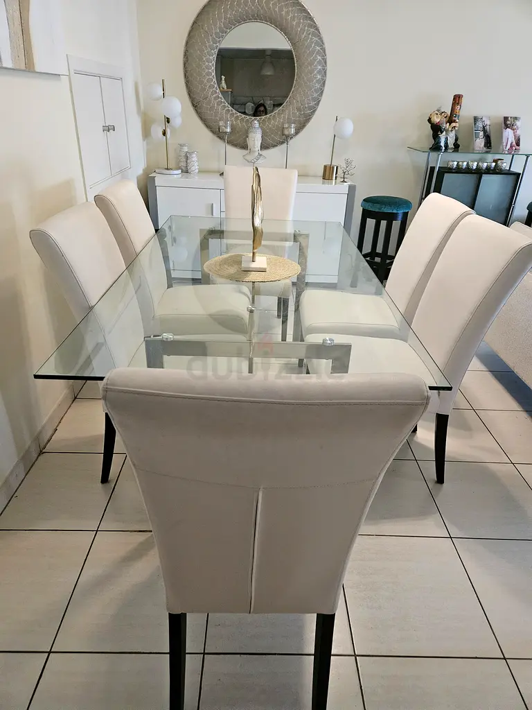 Glass top modern dining table with 6 cushioned chairs