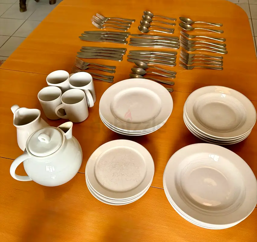 I’m selling a 20-piece white dinnerware set with matching 42-piece stainless steel cutlery and a small tea set. The dinnerware includes dinner plates, salad/dessert plates, and bowls — all plain white with light signs of wear and surface scratches consistent with 5–10 years of normal use. The tea set includes a teapot, milk jug, and four mugs. Cutlery set contains forks, knives, tablespoons and teaspoons; pieces are all stainless steel with average wear and minor scratches. No brand markings, no warranty. Everything is clean and ready to use but shows normal signs of age. Ideal for everyday home use or as a starter set.