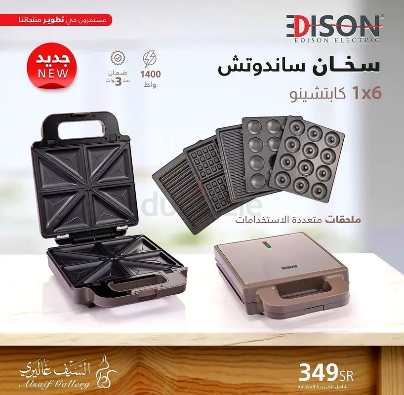 I'm selling my brand new Edison 6-in-1 multi-plate sandwich maker. I never used it — it’s flawless, still in original condition and comes with warranty. It includes interchangeable plates for sandwiches, waffles, mini pancakes, donuts, and more, so it’s versatile for quick breakfasts and snacks. The unit is compact, gray in color, and rated 1400W. I’m asking for 349 SAR but open to reasonable offers.