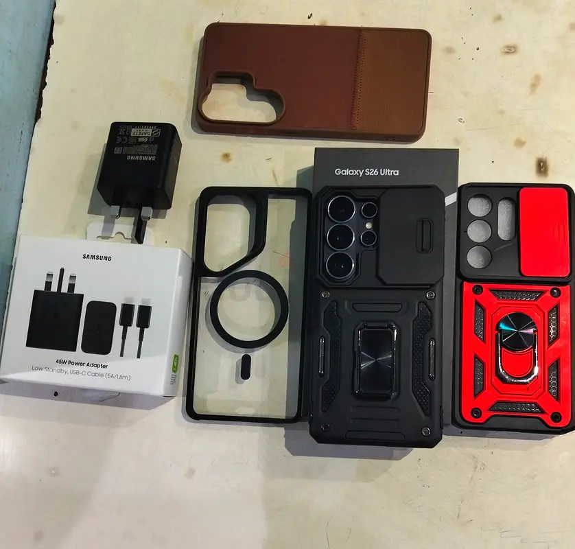 I’m selling a bundle of accessories for a Samsung Galaxy S26 Ultra (256GB, Black). The phone itself is brand new but I’m offering the accessories I used with it: a fast 45W Samsung USB-C charger (in original box), four protective cases (brown leather-style, rugged black with kickstand, red metal-style with ring/tab, and a slim clear/black frame case), plus an extra camera-lens protector/frame. The items are pre-owned but in good condition with no damage to the accessories. Warranty for the phone is still valid. Selling as a set only. Specifications/features: