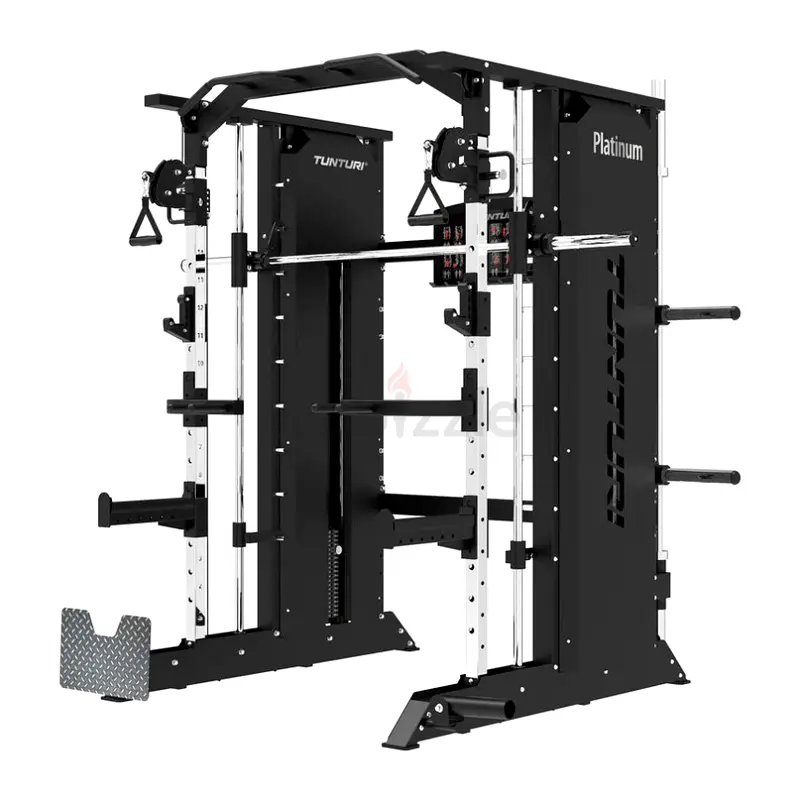 DELIVERY AND INSTALLATION INCLUDED Two-in-one training system: Combines a Smith Machine with dual cable guidance for versatility. Double weight stack: Two independent 100 kg stacks deliver balanced strength development. 16 adjustable pulley positions: Perfectly suited for a wide variety of exercises. Integrated chinning bar for additional training options: Incorporate pull-ups and chin-ups into your training routine to enhance upper body and grip strength. Smooth and noise-free movement: Nylon-coated cables and precision guides ensure seamless, shock-free training. Dimensions: L 162 x W 204 x H 217 cm Weight: 464 kg Weight stack: 2 x 100 kg Weight ratio: 1:2 Material: steel, PU, rubber Muscle groups: full body workout Product code: 25PVS40000 EAN: Two-in-one training system: Combines a Smith Machine with dual cable guidance for versatility. Double weight stack: Two independent 100 kg stacks deliver balanced strength development. 16 adjustable pulley positions: Perfectly suited for a wide variety of exercises. Integrated chinning bar for additional training options: Incorporate pull-ups and chin-ups into your training routine to enhance upper body and grip strength. Smooth and noise-free movement: Nylon-coated cables and precision guides ensure seamless, shock-free training. Complete strength training with a single machine. The Tunturi Platinum Full Smith/Functional Trainer combines guided and free exercises, ideal for full body workouts. The Smith Machine lets you lift heavy weight plates safely, while the dual pulley offers maximum movement freedom and functional training.